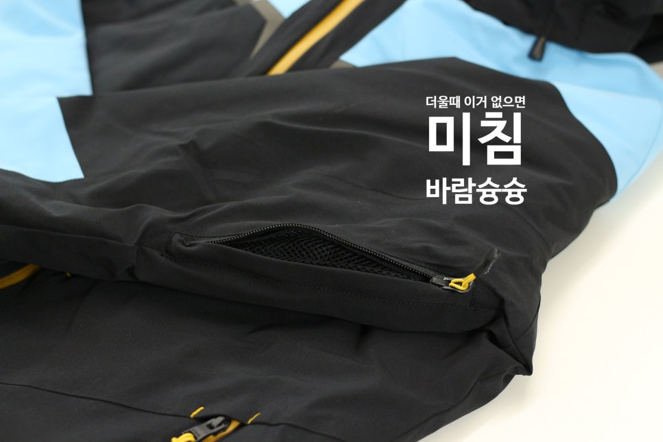 겨드랑이 부분에는 더운 날 땀과 습기 배출을 위해 여닫을 수 있는 벤틸레이션 지퍼가 적용되어 있습니다.