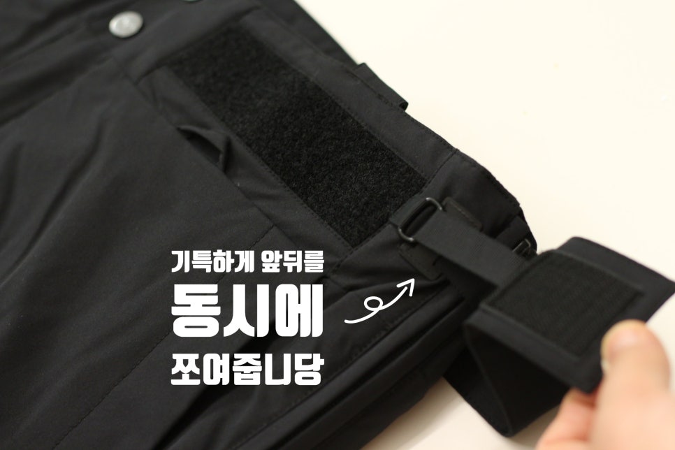 허리조절 밴드가 단순히 기존처럼 묶어 조이는 밴드가 아니라, 이중 당김 밴드 구조로 되어 있어서 균등한 압력으로 당겨 조여주어 착용감이 우수하고 조이더라도 바지 모양이 흐트러지지 않습니다.