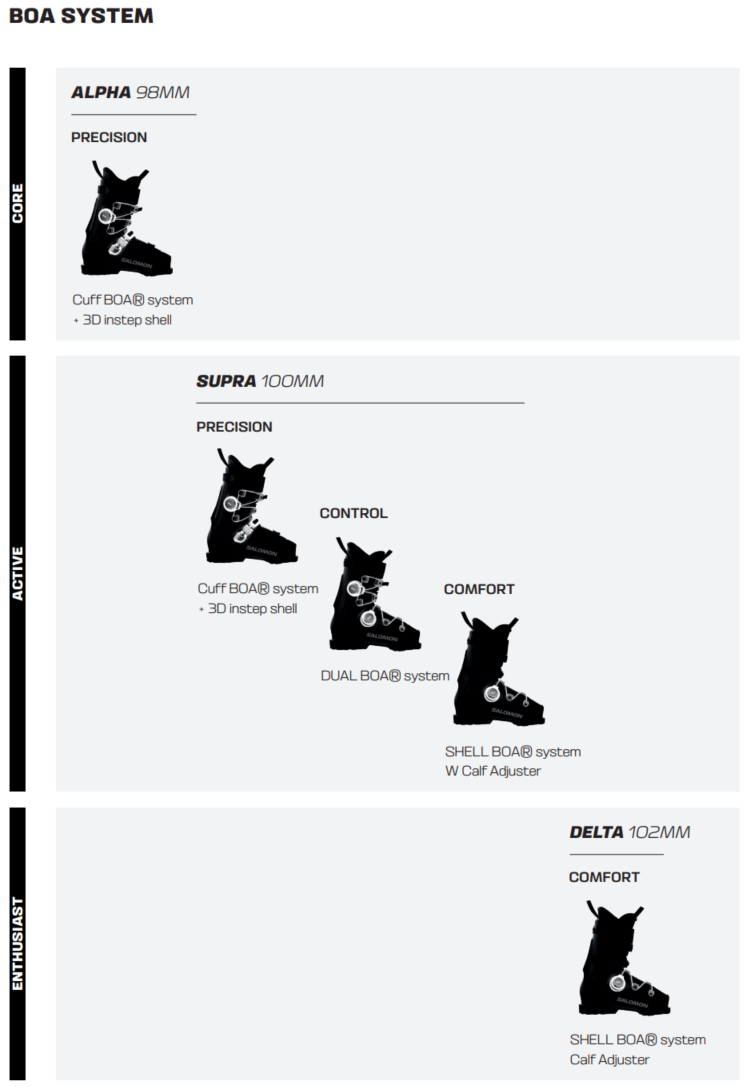 Cuff BOA, Dual BOA, Shell BOA 모델을 모두 구비하고 있어 스키어의 목적과 의도에 따라 선택하면 됩니다.