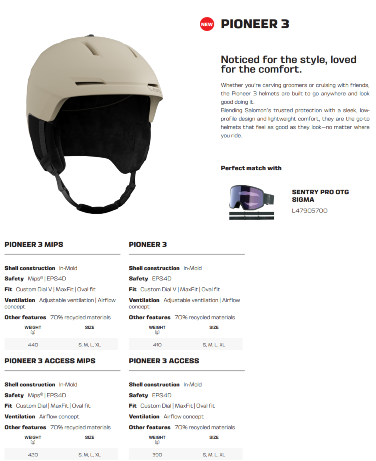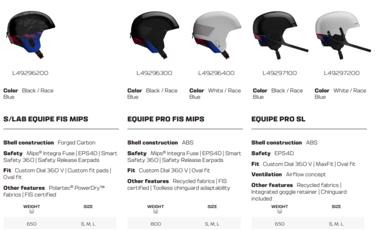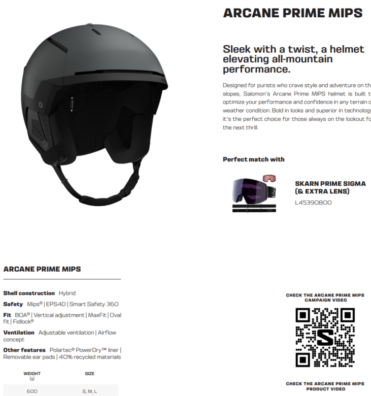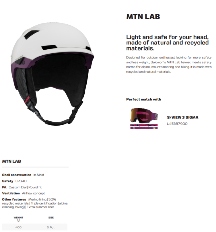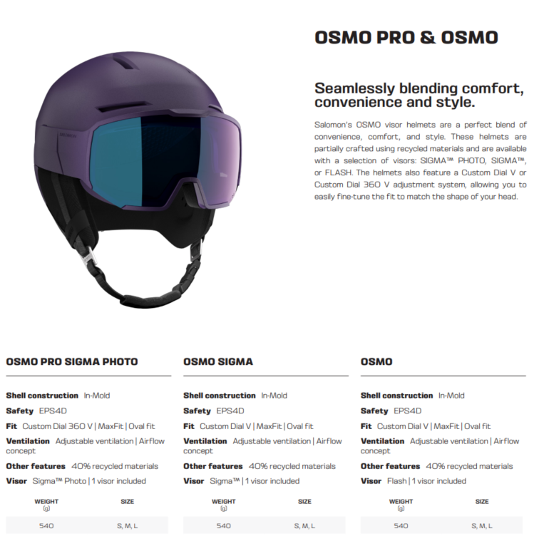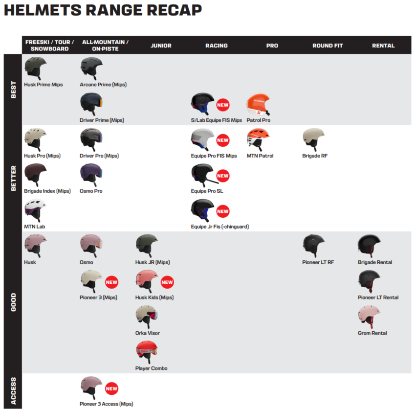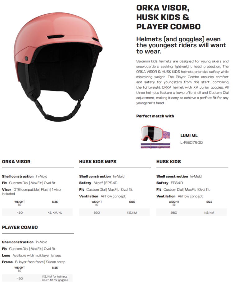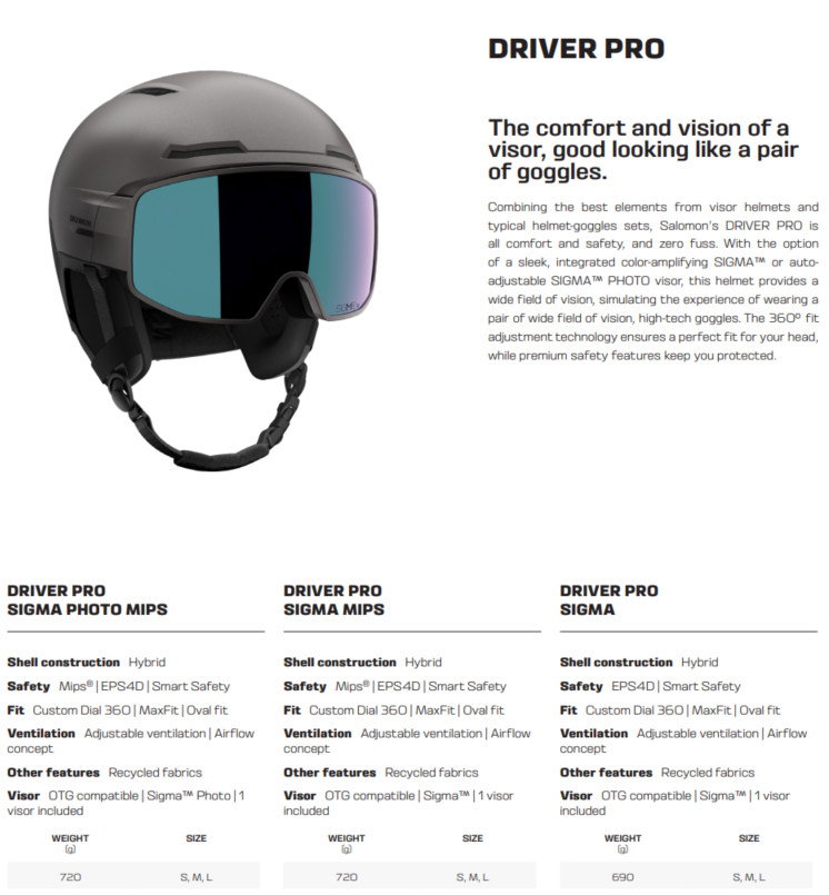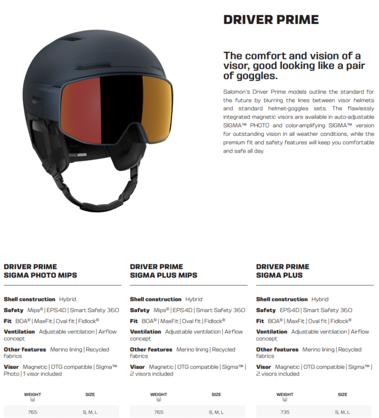 살로몬은 바이저 헬멧을 ALL-MOUNTAIN/ON-PISTE 적응 제품의 맨 앞에 리스팅하고 있습니다.