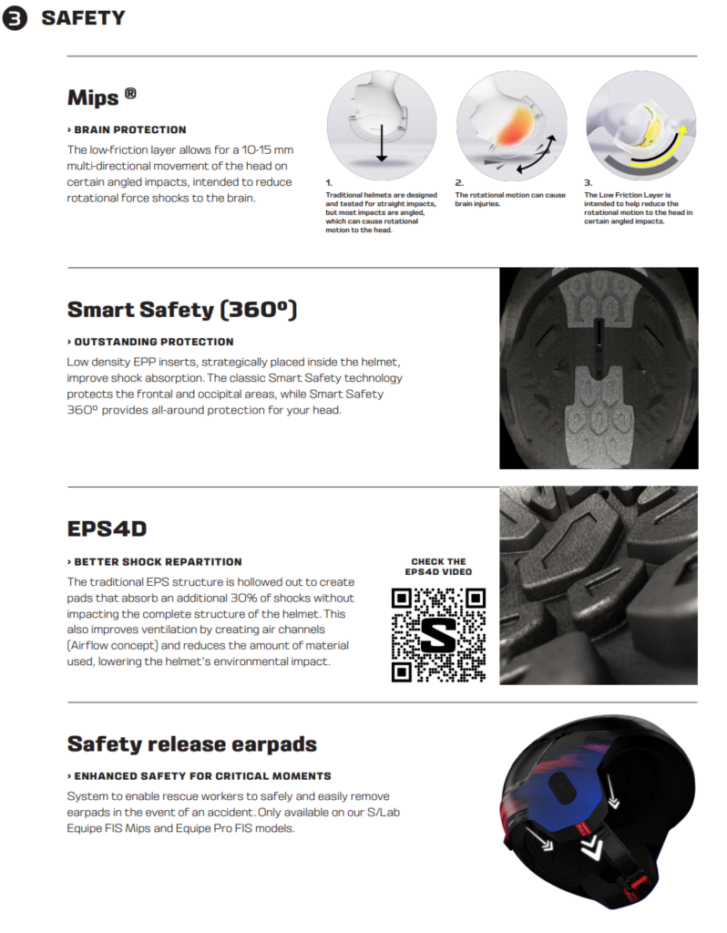 Smart Safety 360은 살로몬에서 유지해 온 360도 전방위에 대한 충격을 완화하는 구조입니다. 결국 이 기제의 목적 역시 MIPS와 같은 것이나 동작하는 방식이 다르고, 결정적으로 MIPS는 3자 인증이기 때문에 공신력이 있어서 상급 모델에는 MIPS를 적용하고 있습니다.