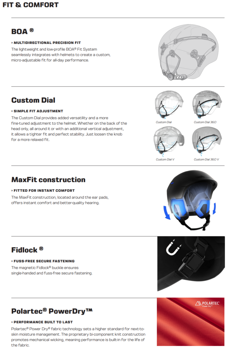 Hybrid 구조로 견고함과 가벼움을 모두 가지고 있고, Mips®, EPS4D, Smart Safety 360 의 여러 안전 시스템을 가지고 있으며 편의기능 또한 Fit BOA®, MaxFit, Fidlock® 등 모든 옵션이 들어가 있습니다.