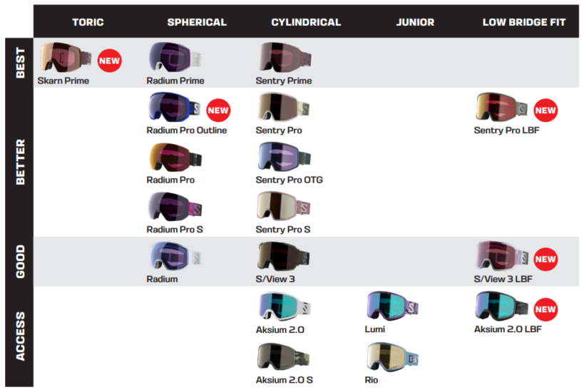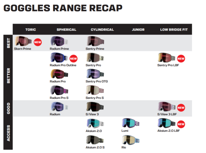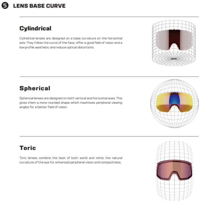 고글 라인은 위 도표에서도 분류되어 있듯이 렌즈의 곡률에 따른 분류가 우선 중요하다 생각됩니다. 이는 개인의 취향 차이이지만 의외로 본인에게 맞지 않는 곡률에 적응을 못하는 스키어/라이더가 많기에 어느 정도는 강제성마저 있는 부분입니다.