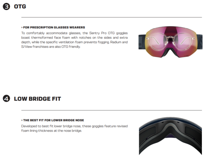 안경을 끼고 고글을 착용할 수 있게 고글 내부의 공간을 확보한 OTG 적용 프레임을 가지고 있으며 동양/아시아인에 곡률에 맞게끔 Fitting 된 아시안핏으로 출시됩니다. (일부 모델)